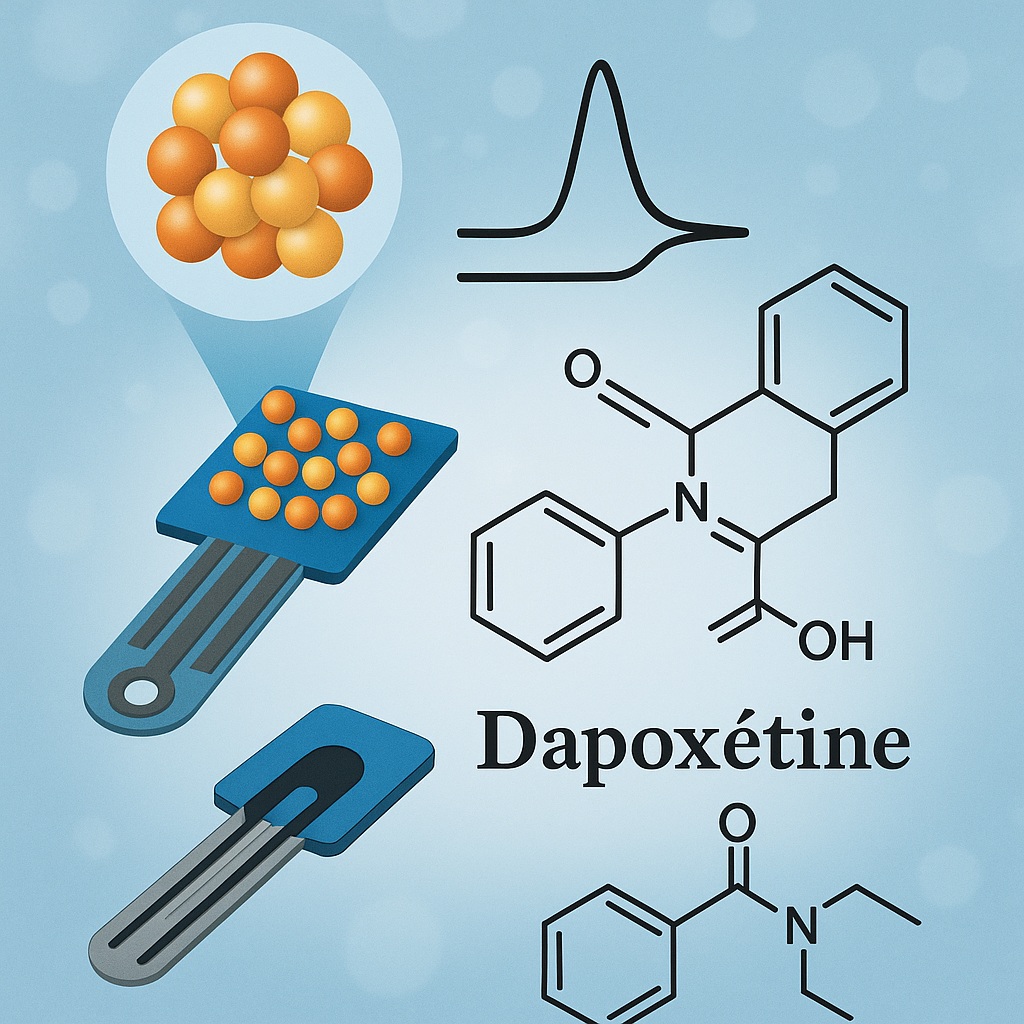 Cette combinaison nanotechnologique s’est révélée particulièrement efficace. L’or apporte une excellente conductivité, tandis que le césium améliore les cinétiques de transfert d’électrons. Le résultat : une surface électroactive optimisée, capable de détecter des concentrations infimes de dapoxétine.